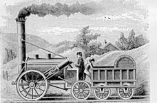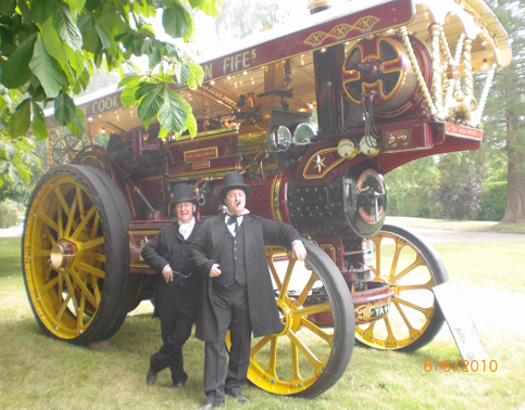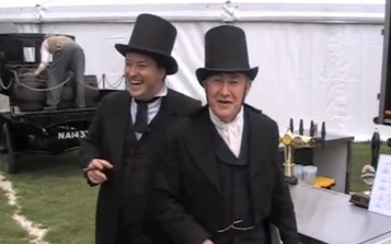 Messrs Brunel and Stevenson pose by a great steam engine.