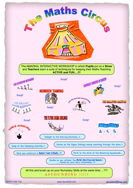 Developed alongside AST Maths teacher Nick McIvor, is a dynamic, two-day, highly active and fun set of workshops for groups of around 60, leading to a circus-themed performance given by the pupils and based entirely on Maths...!